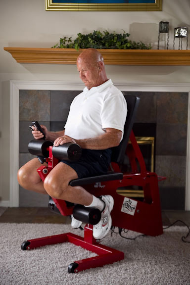 The device uses a simple but effective concept for stretching the knee joint. The patient uses a handheld control to activate a small motor attached to the frame of the device that moves the lever arm forward and back. The patient has complete control and can increase or decrease the intensity of the stretch on the knee joint as tolerated. Because the patient remains in control of the stretch at all times, we are able to virtually eliminate muscle-guarding so the patient can achieve maximum stretching of the knee joint.